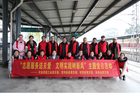 2月5日,正值兔年元宵佳节到来之际,财务处党支部与校工会党支部、宣传统战党支部、学团创党支部来到宜州火车站,联合宜州车站客运党支部开展“志愿服务送关爱 文明实践树新风”主题党日活动,发挥党员先锋模范作用,用行动践行党的二十大精神,树立文明新风貌。